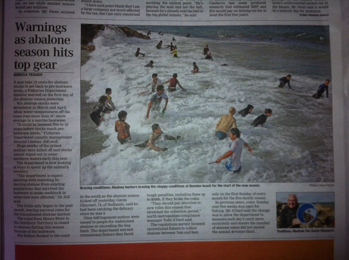 Abalone season started yesterday Posted on 2011/11/072011/11/07 by TheFishVet - Richmond's School of Fish From today’s West Australian. Share this: Share on Facebook (Opens in new window) Facebook Share on X (Opens in new window) X Share on LinkedIn (Opens in new window) LinkedIn Email a link to a friend (Opens in new window) Email Print (Opens in new window) Print Like Loading... Published by TheFishVet - Richmond's School of Fish Aquatic veterinary medicine, pathology and educational services for fish. A repository for useful information and events. View all posts by TheFishVet - Richmond's School of Fish