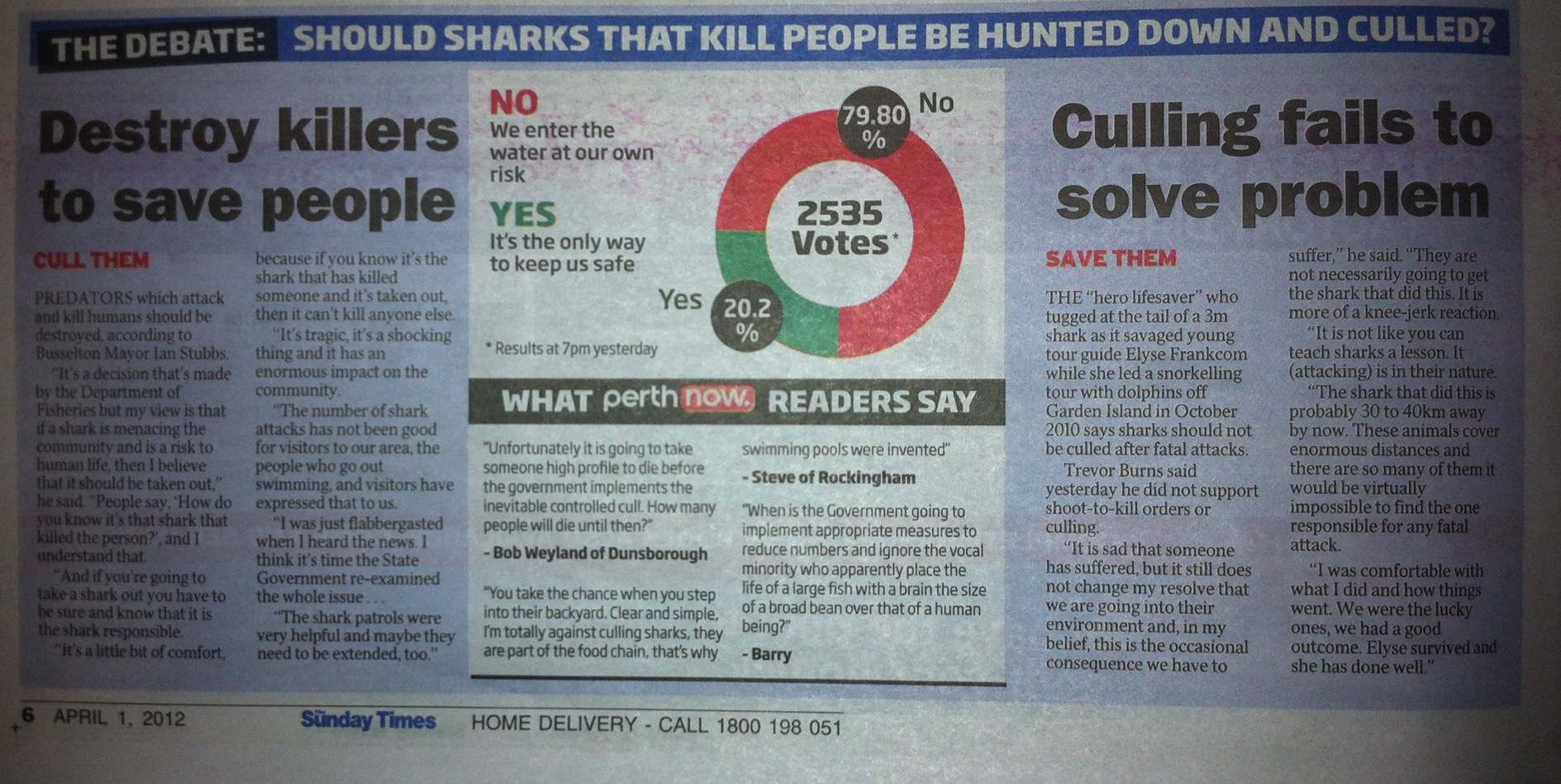 2. I am relieved to see that 79.80% voted NO to the culling of killer sharks. Afterall sharks are wild creatures, the ocean is their territory and they will kill to survive!