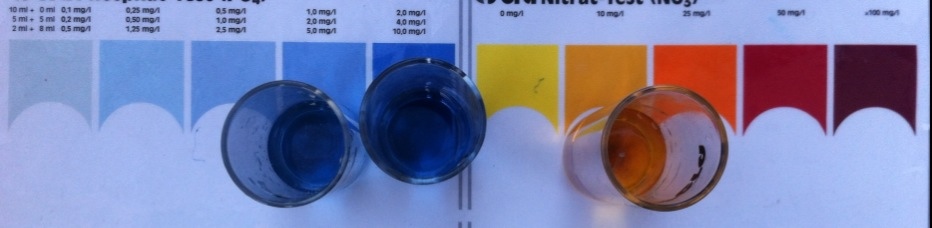 Nitrate levels may be low, but have you checked what the phosphate levels are? Pictured below is an example of what good water quality analysis will show up. The nitrate level (right) is a low 10mg/L, but notice the phosphate level (left) falls between 5-10mg/L (using the highest dilution factor)! Phosphate levels should be maintained below 1mg/L to help reduce algal problems. This is one example where no matter how much chemicals you keep adding to the pond, it won’t have a long term effect.