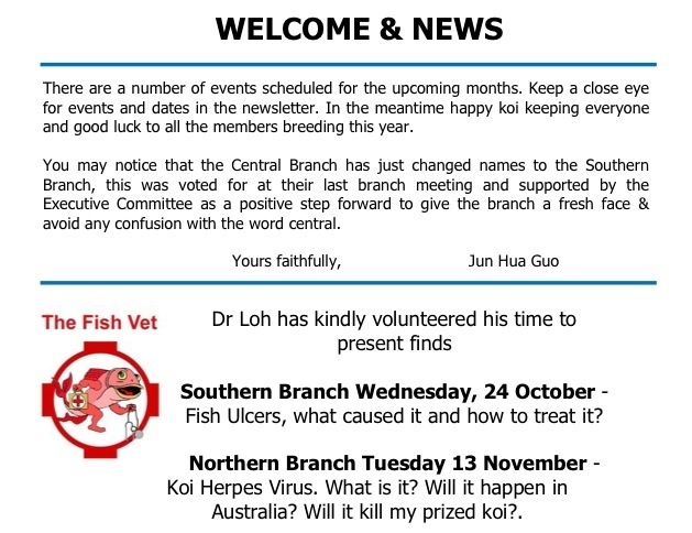 Dr Loh addresses the Koi Society with two talks. Posted on 2012/10/17 by TheFishVet - Richmond's School of Fish Want to know about ulcers in koi fish? Want to know about koi herpesvirus? Then come along to the next two Koi Society of Western Australia’s meetings. Details are provided below. Share this: Share on Facebook (Opens in new window) Facebook Share on X (Opens in new window) X Share on LinkedIn (Opens in new window) LinkedIn Email a link to a friend (Opens in new window) Email Print (Opens in new window) Print Like Loading... Published by TheFishVet - Richmond's School of Fish Aquatic veterinary medicine, pathology and educational services for fish. A repository for useful information and events. View all posts by TheFishVet - Richmond's School of Fish