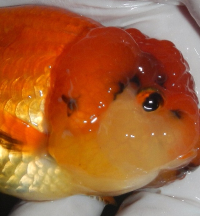 Chronic inflammatory lesions tend to have melanin deposits as is shown here with the multifocal black skin pigmentation. This fish is healing from previous skin ulcers attributed to gyrodactylosis (skin flukes). Note that the epidermal proliferation around the head is normal for this breed (ranchu). It is called a ‘wen’ or ‘hood’. Sometimes the ‘wen’ can grow so much that it’ll grow over the eyes causing obstruction to sight and will need to be surgically trimmed.