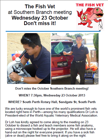 Dr Loh has kindly agreed to come along to the meeting on 23 October to dissect a fish and teach members some fish anatomy, using a microscope hooked up to the projector. He will also have a hand-out on the night for everyone present. If you have a sick fish (alive or dead) please feel free to bring it along on the night.