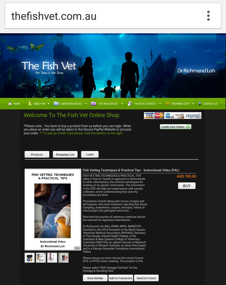 FISH VETTING TECHNIQUES & PRACTICAL TIPS takes a ‘how to’, hands-on approach to demonstrate veterinary skills employed in working as an aquatic veterinarian. The 105 minute DVD comprises veterinary procedures including taking skin mucus scrapes and gill biopsies, skin ulcer treatment, injecting fish, blood sampling, anaesthesia, surgery, necropsy, histology processing, videos of live microscopic fish pathogens and more… That’s right, I’m giving away all my secrets so that fish clients can have greater access to trained aquatic veterinarians no matter where they are in the world.