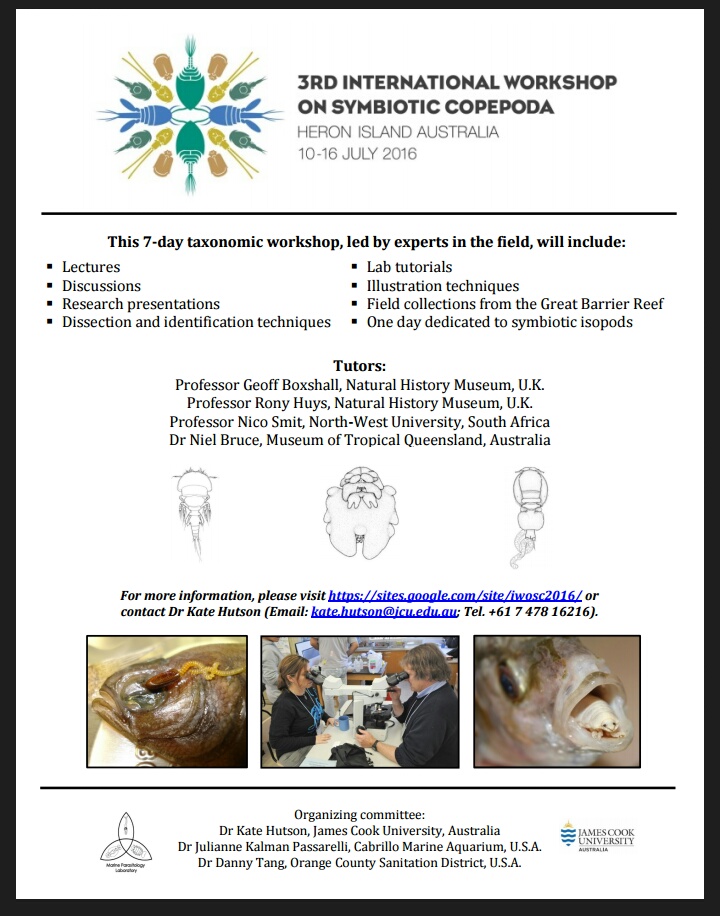 It is my pleasure to let you know that Australia is hosting the 3rd International Workshop on Symbiotic Copepoda on Heron Island 10-16 July next year. This event will be led by international experts in the field and include seminars, practical workshop and local collections. It will also include one day dedicated to symbiotic Isopoda.