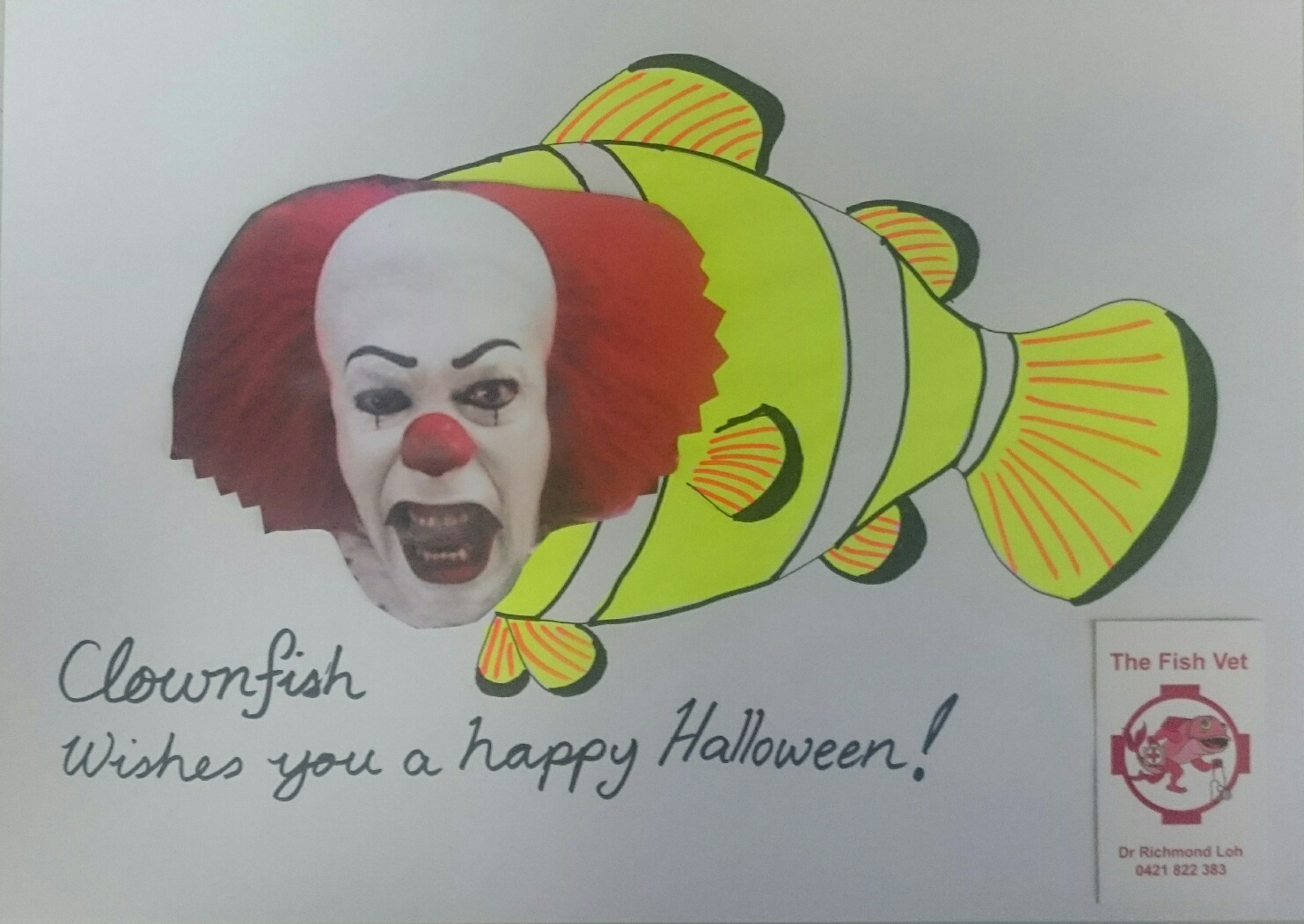 Nemo meets IT! Wishing everyone a happy Halloween! Posted on 2015/10/292015/10/29 by TheFishVet - Richmond's School of Fish Now this is what I call a clownfish! Share this: Click to share on Facebook (Opens in new window) Facebook Click to share on X (Opens in new window) X Click to share on LinkedIn (Opens in new window) LinkedIn Click to email a link to a friend (Opens in new window) Email Click to print (Opens in new window) Print Like Loading... Published by TheFishVet - Richmond's School of Fish Aquatic veterinary medicine, pathology and educational services for fish. A repository for useful information and events. View all posts by TheFishVet - Richmond's School of Fish
