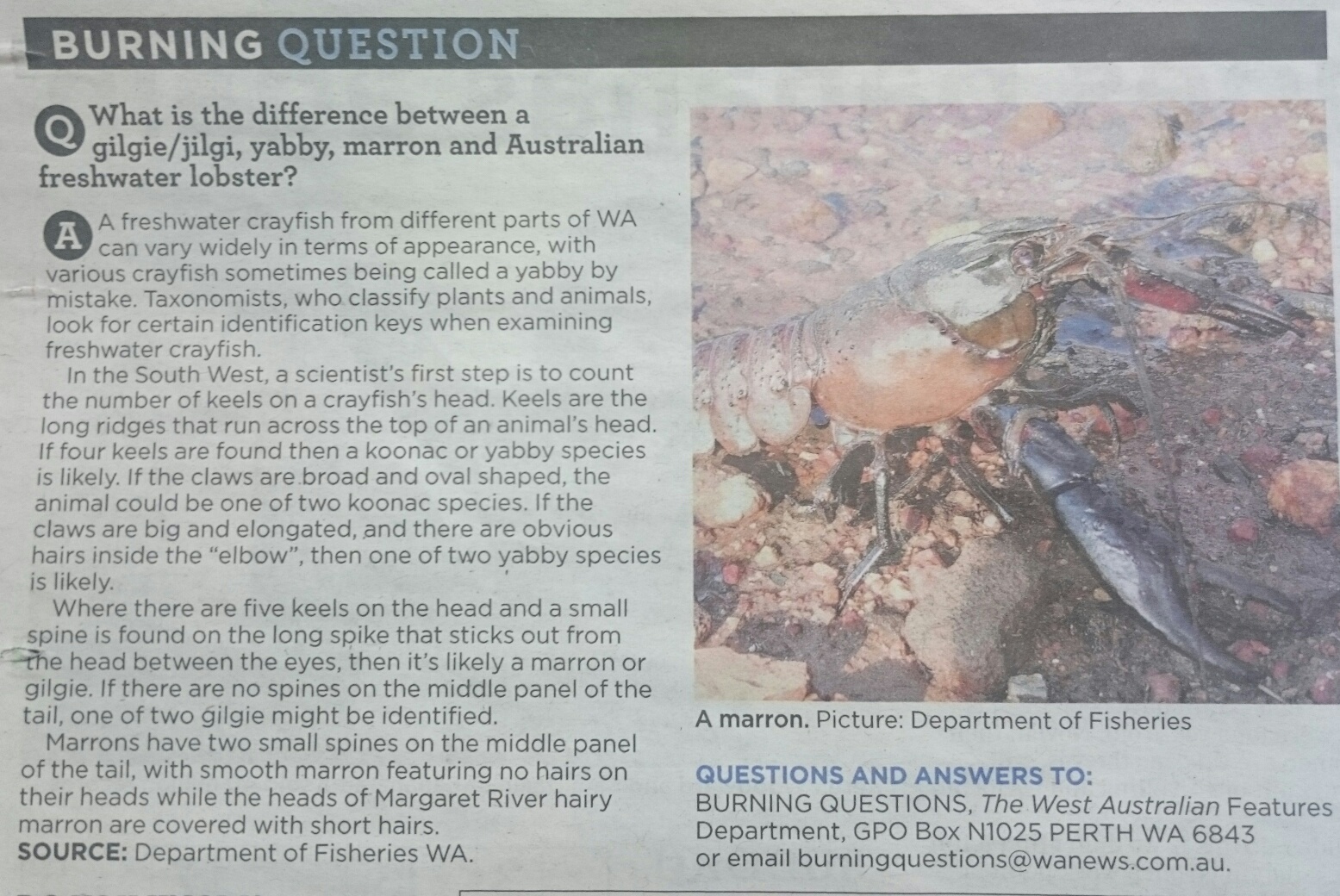 What’s the difference between a yabby, marron, gilgie/jilgie, and Australian freshwater lobster? Posted on 2016/02/032016/02/03 by TheFishVet - Richmond's School of Fish Nice one I came across in today’s newspaper. Share this: Click to share on Facebook (Opens in new window) Facebook Click to share on X (Opens in new window) X Click to share on LinkedIn (Opens in new window) LinkedIn Click to email a link to a friend (Opens in new window) Email Click to print (Opens in new window) Print Like Loading... Published by TheFishVet - Richmond's School of Fish Aquatic veterinary medicine, pathology and educational services for fish. A repository for useful information and events. View all posts by TheFishVet - Richmond's School of Fish