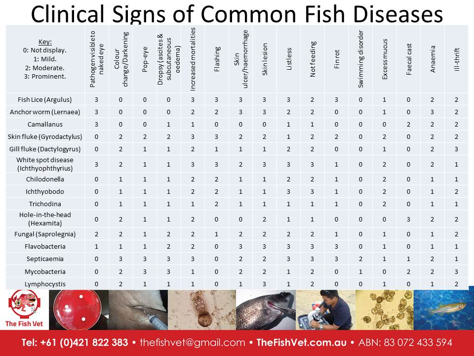 I’ve tabulated some of the common infectious diseases I see in fishes, and their clinical signs.