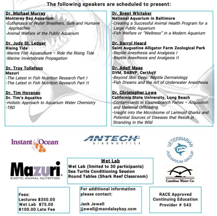 The Shark Reef Aquatic Medicine Seminar 2018 is set to go with another fantastic line-up of presenters. Join us in Las Vegas on March 2nd, 3rd, and 4th for three days of information packed presentations centered on practical applications of aquatic medicine in day-to-day situations.