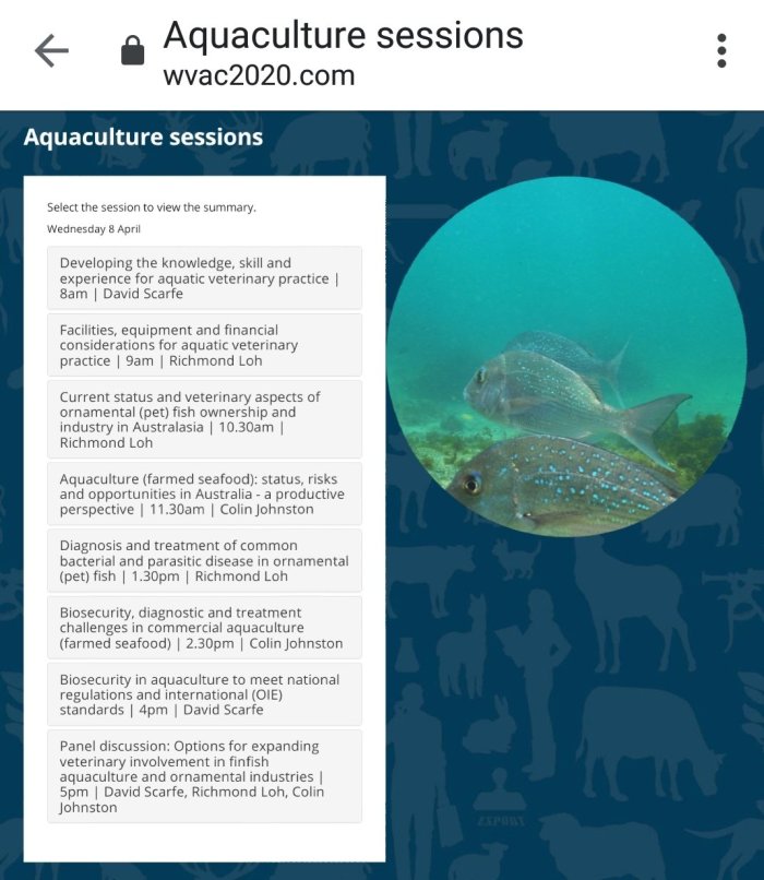 I hope to see you there. I will be presenting on the ornamental pet fish aspects of fish vetting, and Doctor Colin Johnston will be presenting on the food fish industries. Dr David Scarfe will cover biosecurity and regulatory aspects.