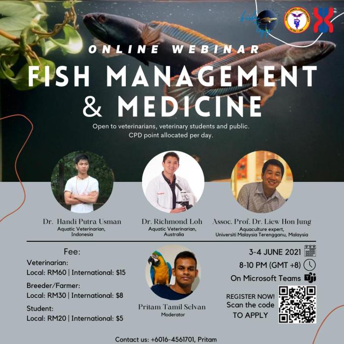 🔉🗯Boost your knowledge about Fish Management and Medicine by joining this online webinar organized by Fishology Enterprise (Students of Veterinary Medicine Year 3, Universiti Malaysia Kelantan), featuring popular Aquaculture Expert and 2 popular Aquatic Veterinarians from across the globe! This webinars covers on internal medicine, surgery as well as case studies that you don’t want to miss out, so REGISTER NOW before 2nd of June 2021!
