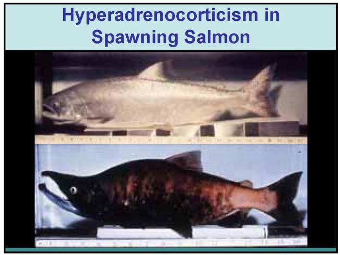 In salmon, there is increased hypothalamic-pituitary-adrenal activity, in a physiological condition known as "hyperadrenocorticism". In salmon, this goes into overdrive! Their cortisol levels peak and this enables them to catabolise their muscles, to give them fuel for their long journey without having to stop to feed. It’s like a fish on some performance enhancing drug!