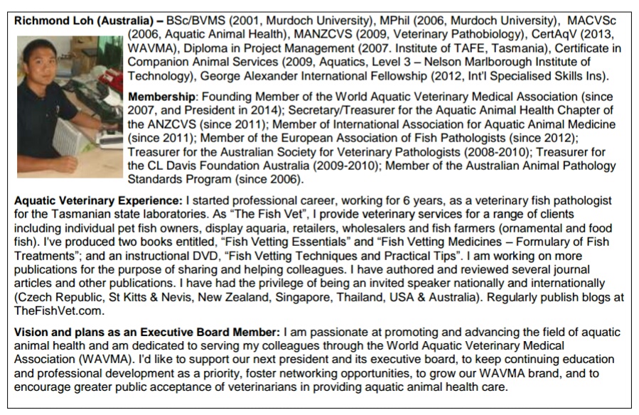 Dr Richmond Loh DipProjMgt, BSc, BVMS, MPhil (Pathology), MANZCVS (Aquatics & Pathobiology), CertAqV, CMAVA, NATA Signatory.